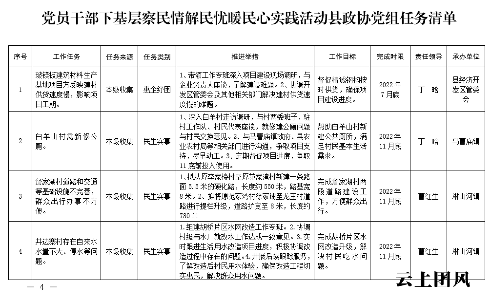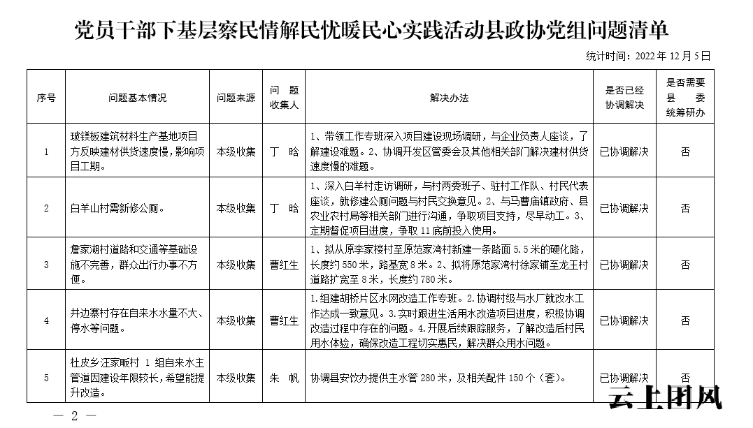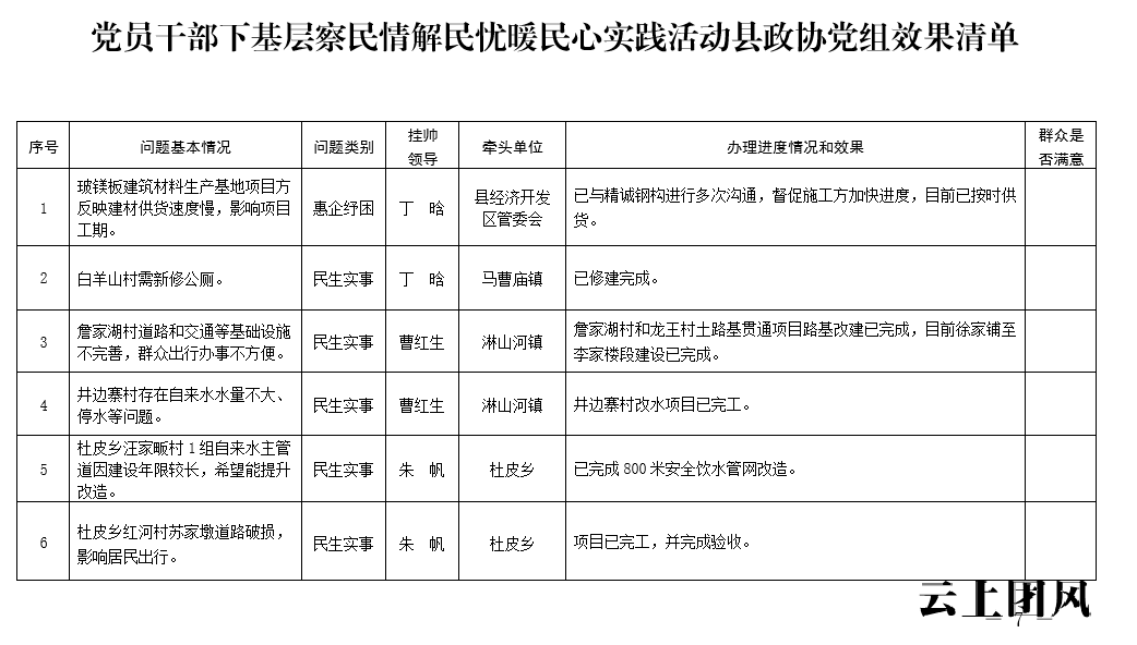 根据省委、市委、县委关于开展党员干部下基层察民情解民忧暖民心实践活动的有关要求,县政协党组深入开展大走访、大调研、大座谈系列活动,认真收集各类意见和建议,锁定了一批突出问题,形成了问题清单、任务清单、效果清单,经研究,现予以公示。