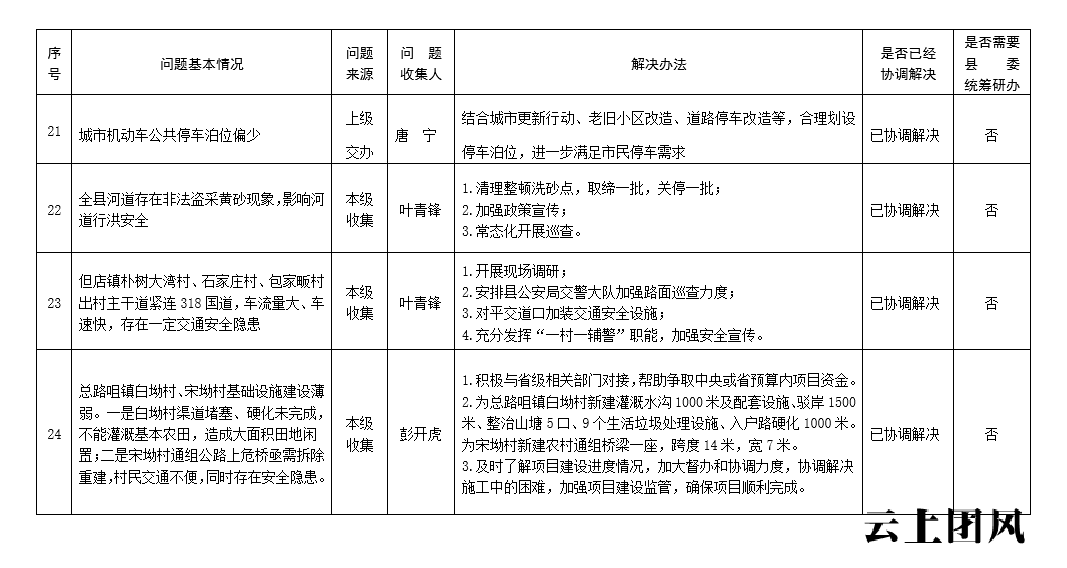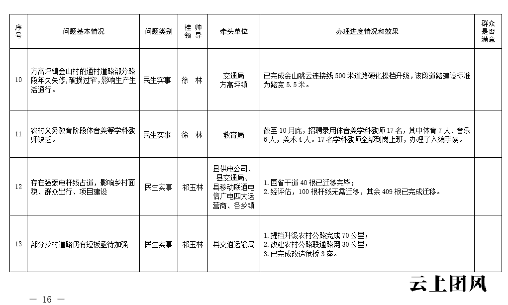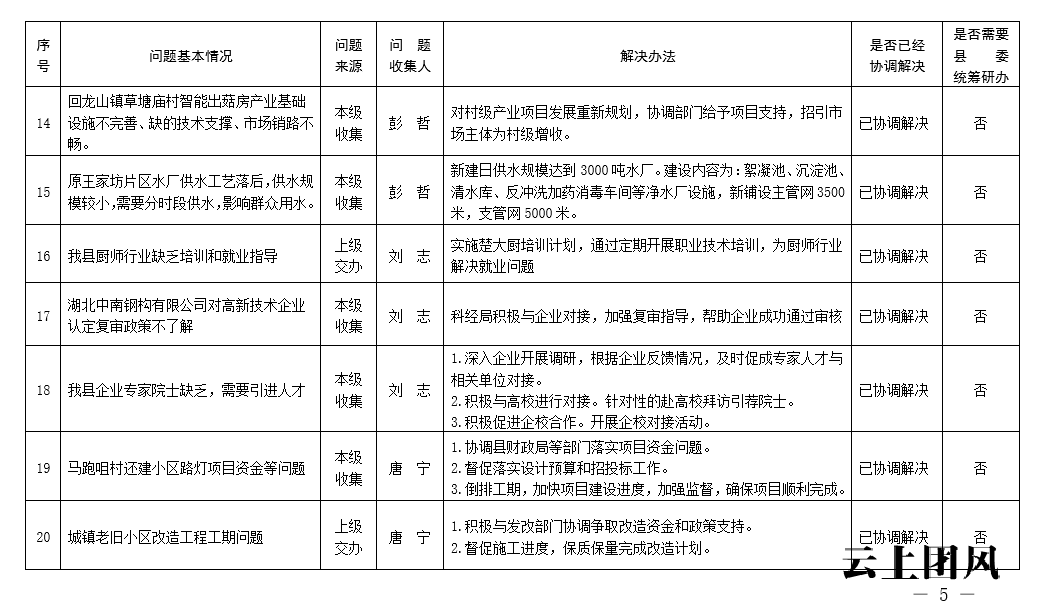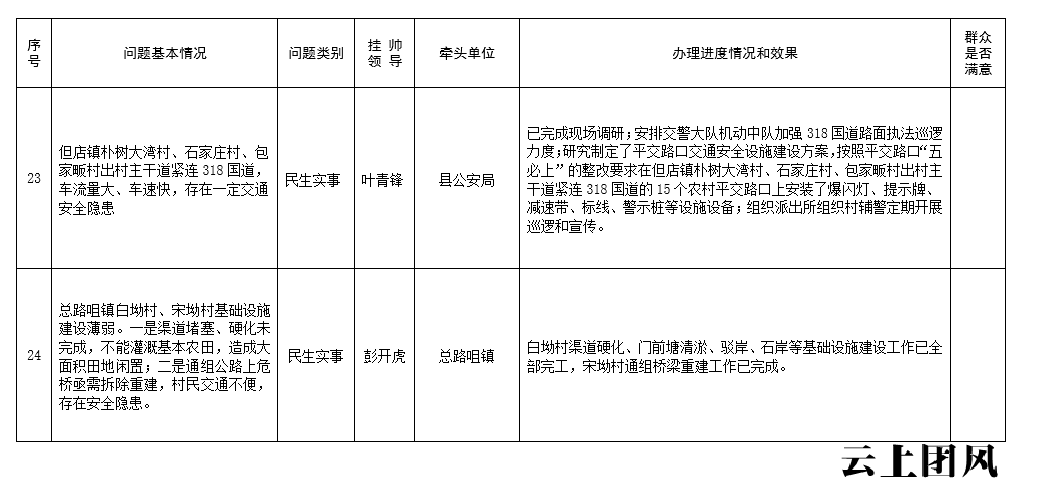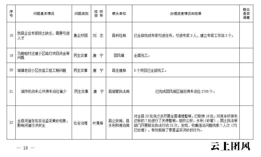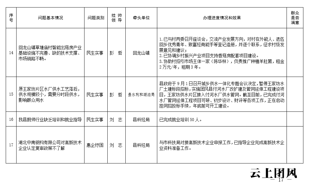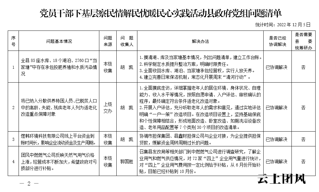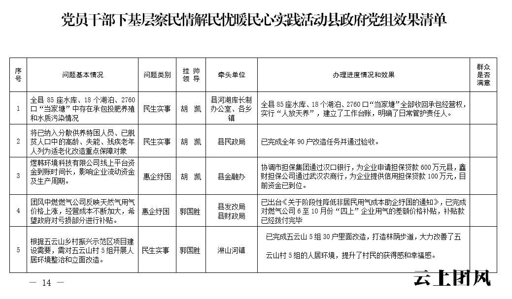 根据省委、市委、县委关于开展党员干部下基层察民情解民忧暖民心实践活动的有关要求,中共团风县人民政府党组深入开展大走访、大调研、大座谈系列活动,认真收集各类意见和建议,锁定了一批突出问题,形成了问题清单、任务清单、效果清单,经研究,现予以公示。