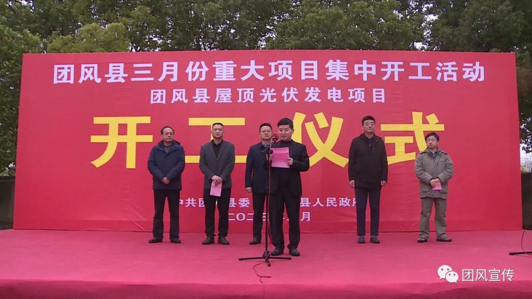 在团风县屋顶光伏发电项目开工仪式现场,县委常委、组织部长张毅出席并宣布项目开工,副县长刘志主持开工仪式并致辞,县政协副主席李文、开发区管委会主任倪俊杰出席开工仪式。