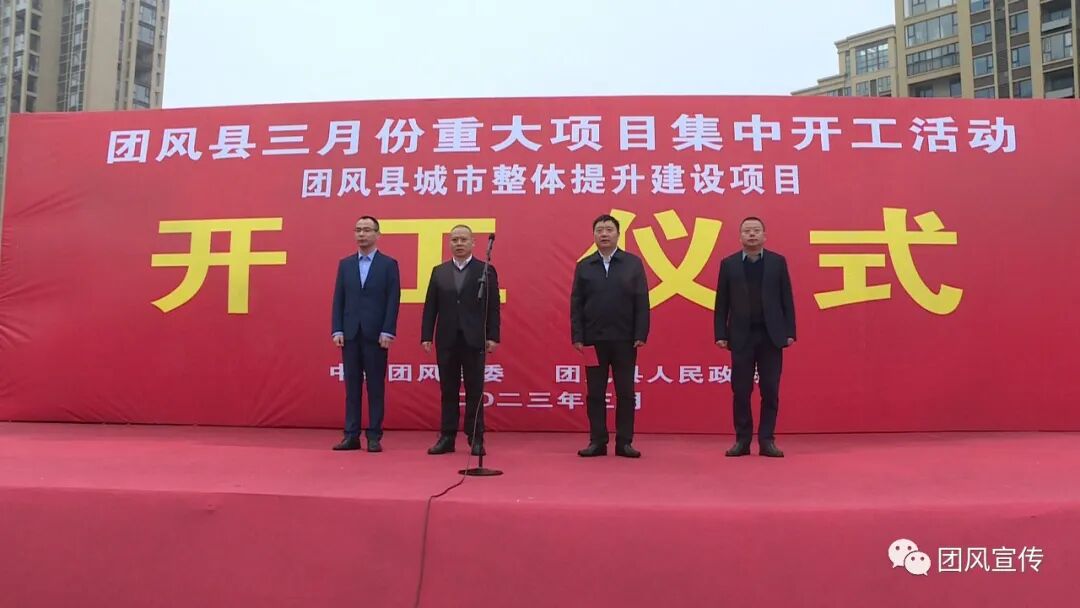 在团风县城市整体提升建设项目(EPC)总承包项目开工仪式现场,县人大常委会副主任丰雷霆主持开工仪式并致辞,副县长唐宁宣布项目开工,县住建局主要负责人介绍了开工项目情况,施工单位作了表态发言。