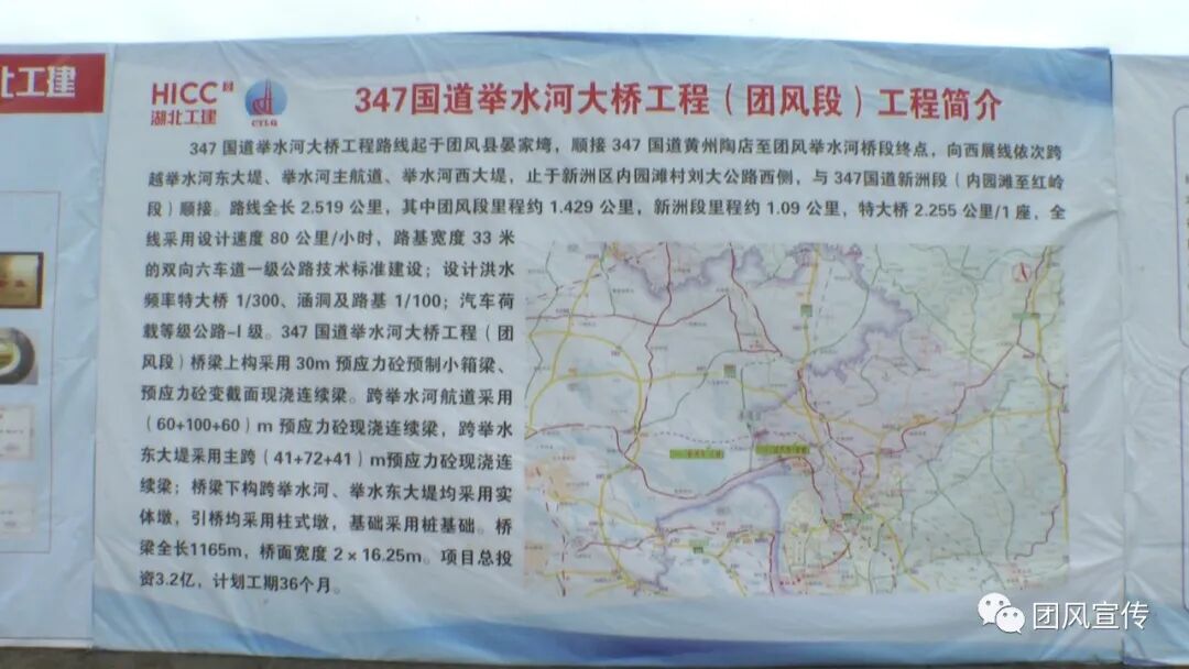 该项目路线起于团风镇六房湾,跨举水河东大堤、举水河主航道、举水河西大堤,止于新洲区内园滩刘大公路西侧,与347国道新洲段相接,全长2.519公里,其中团风段里程1.429公里,新洲段里程1.09公里。桥梁采用双向六车道一级公路技术标准建设,设计车速80公里/小时,桥面全宽33米。项目总投资约3.1亿元,计划建设工期36个月。