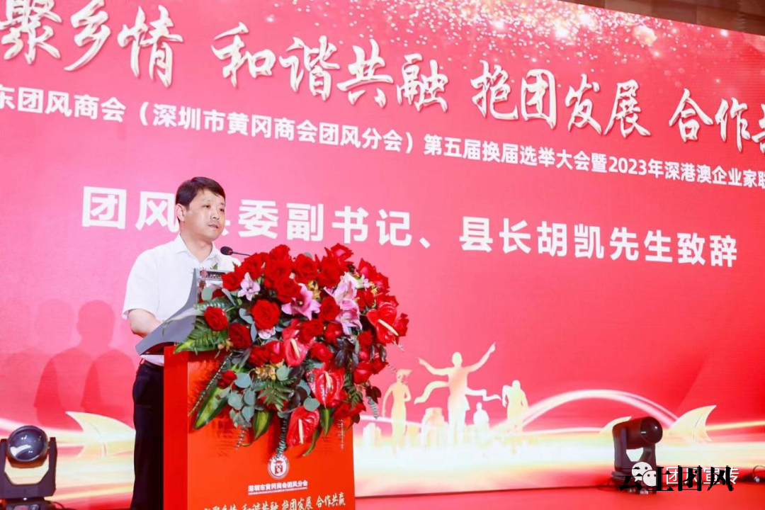 胡凯代表团风县委、县人大、县政府、县政协,对此次换届选举大会的胜利召开表示热烈的祝贺,并发表了致辞,感谢商会长期以来对家乡建设发展的关心和支持,欢迎商会回乡投资发展,造福桑梓。同时对新一届商会提出了三点期望:一、真诚期待广东团风商会充分发挥联系广泛、信息量大的优势,勇当家乡的“代言人”,热心宣传推介团风,积极搭建桥梁,吸引更多人才到团风发展,吸引更多企业到团风落户,为家乡高质量发展提供有力支撑。二、真心呼唤各位在外创业成功人士,在合适的时机返乡创业,把自身发展与团风发展,把个人富裕与家乡富裕紧密连在一起,支持家乡建设,带动家乡发展,带领乡亲脱贫致富,共同谱写团风高质量发展新篇章。三、真情希望广东团风商会团结带领广大企业家们,坚定信心、昂扬激情,弘扬企业家精神,把个人价值、企业前途,融入新时代中国特色社会主义伟大事业,以强烈的担当精神,扛起时代使命,在全面建设社会主义现代化国家的新征程上,鲲鹏展翅九万里,逐梦扬帆再起航!并郑重承诺,团风将以最优质的服务、最优良的环境、最优惠的政策,竭诚为广大投资者们创造条件、提供舞台,让各位企业家放心投资、安心经营、专心创业。