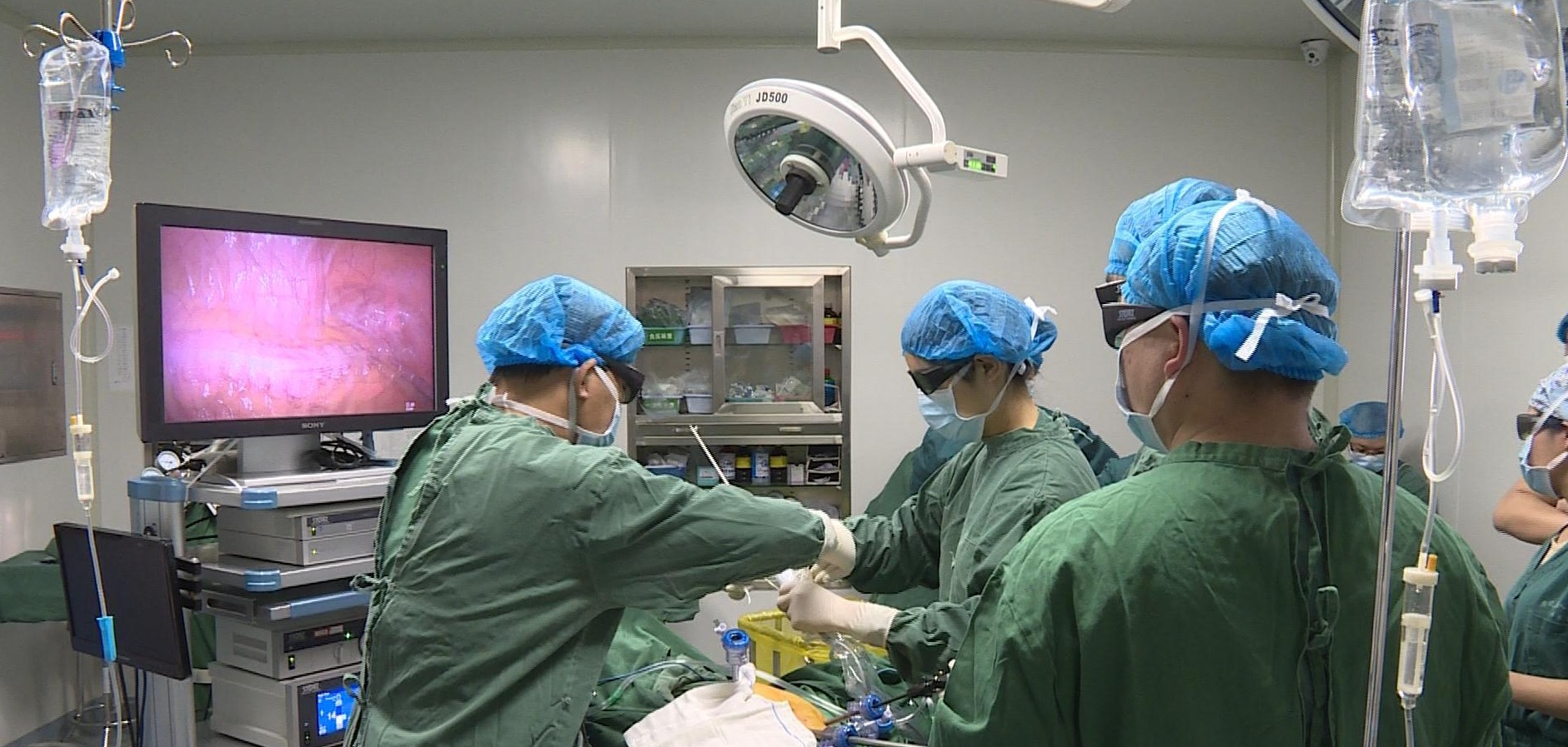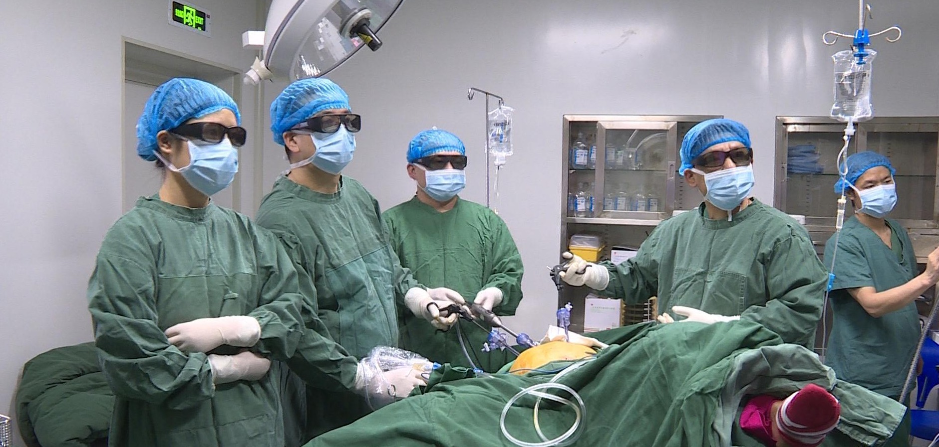 手术台前,县人民医院普通外科主任徐世荣和他的团队全都戴上3D眼镜,眼前大屏幕原本重影的图像立刻变得立体清晰。