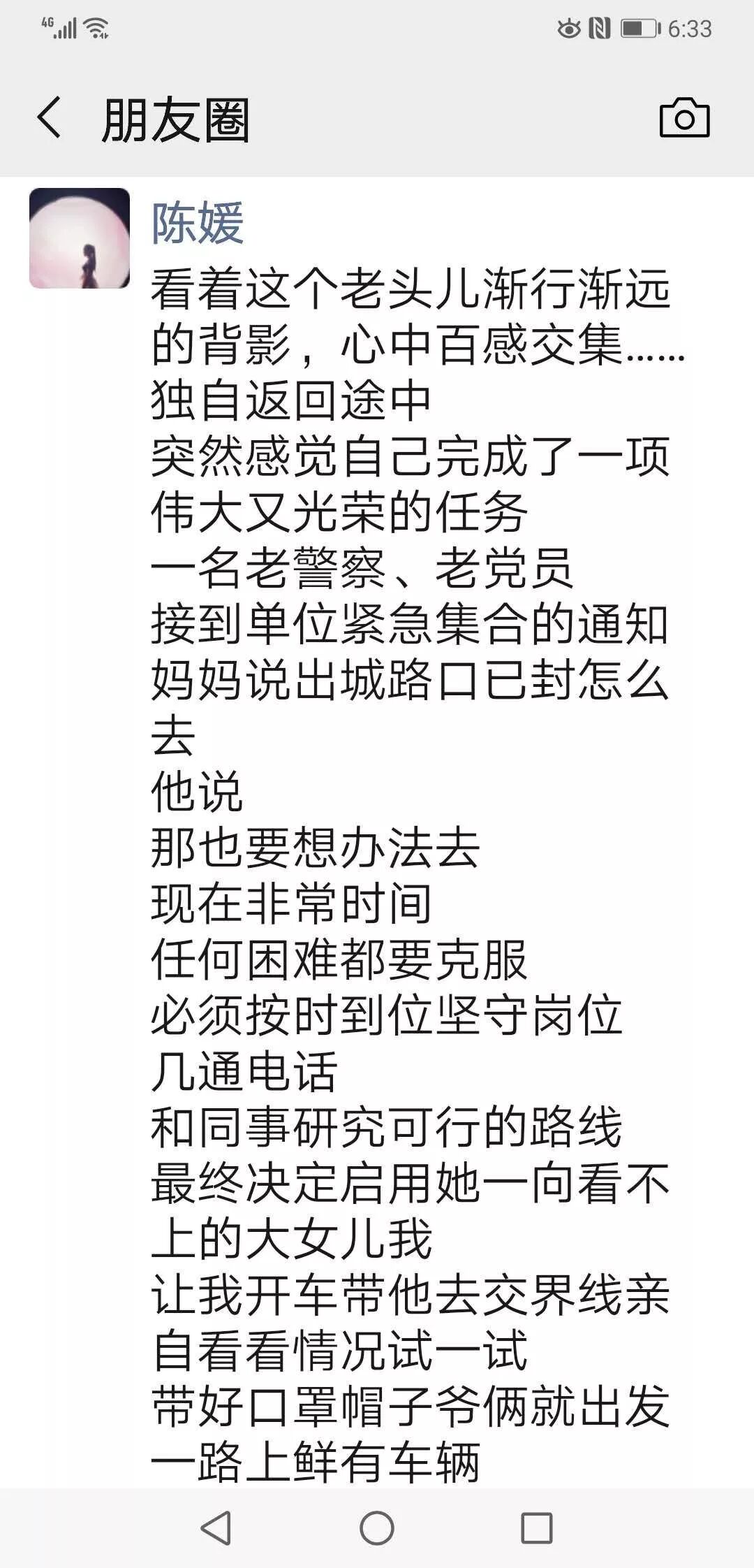 陈华新同志,拘留所老民警,今年58岁,先后多次做过心脏支架手术,身体状况比较差。除夕夜陈华新同志刚上完24小时班,初一早晨轮休。当天下午得知疫情防控县局任务重,警力不足的情况后,在没有接到单位通知的情况下,主动请战,自行驾车从黄冈市区返回团风,要求参加战时任务。在黄冈市区已经封路的情况下,他跟家人说:“封路也要想办法回单位,现在是非常时期,任何困难都要克服,我必须坚守岗位”。他的女儿为此写下一首感人肺腑的长文,记述他主动参战的经过,诠释一名老民警、老党员的家国情怀。
