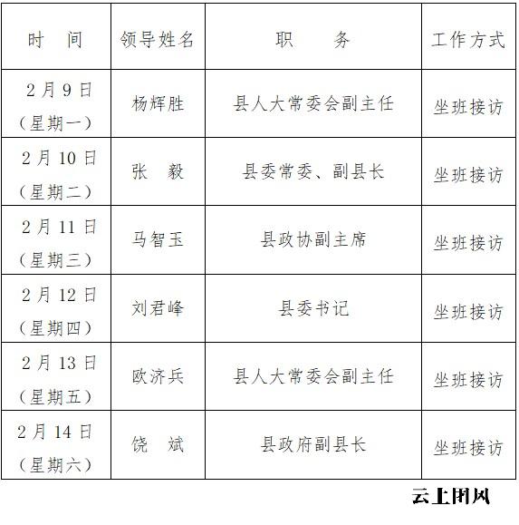 为进一步践行党的群众路线,加强和改进人民信访工作,畅通信访渠道,倾听群众意见,依法就地及时解决群众合理诉求,根据工作安排,现将2026年2月9日至14日县领导接访下访安排公示如下: