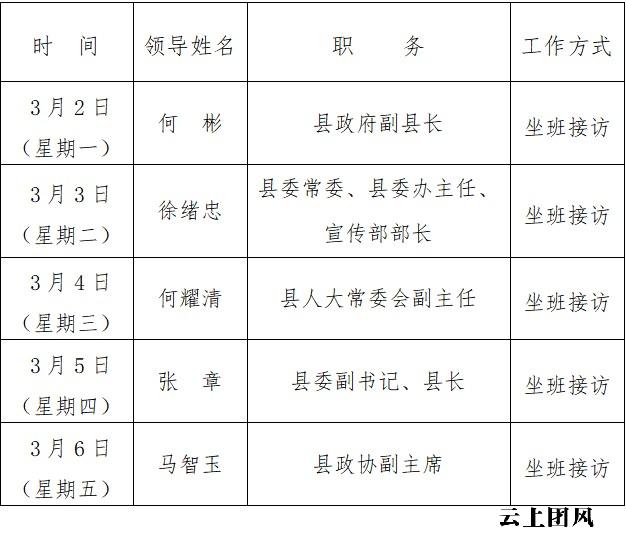 为进一步践行党的群众路线,加强和改进人民信访工作,畅通信访渠道,倾听群众意见,依法就地及时解决群众合理诉求,根据工作安排,现将2026年3月2日至6日县领导接访下访安排公示如下: