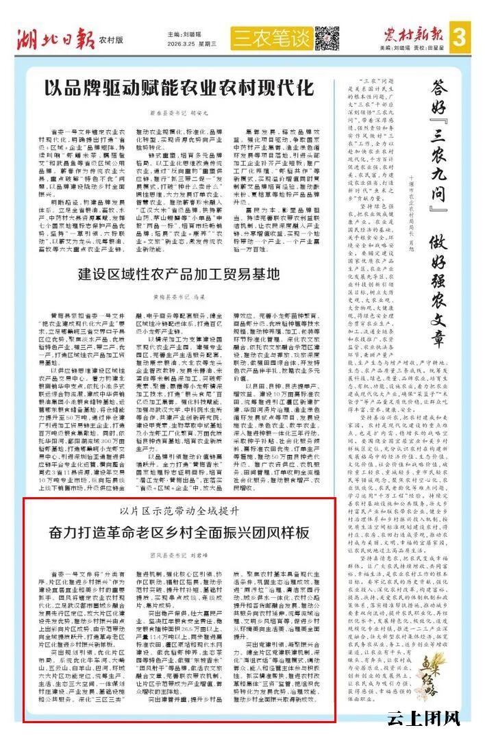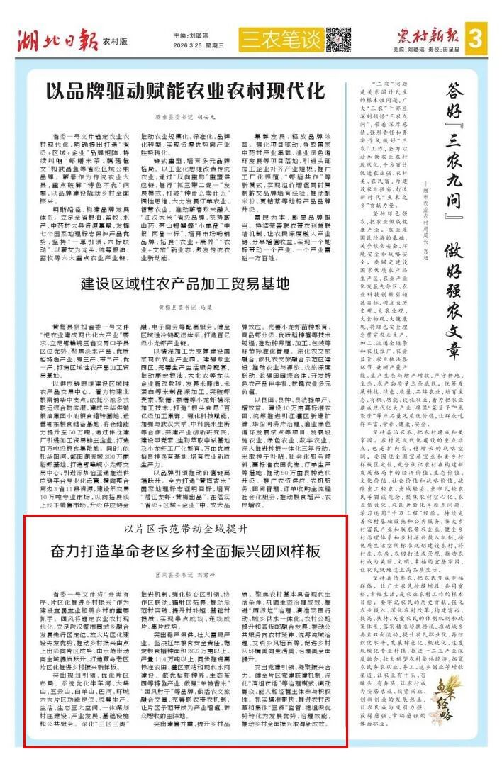3月25日,湖北日报农村新报刊发县委书记刘君峰署名文章《以片区示范带动全域提升 奋力打造革命老区乡村全面振兴团风样板》。