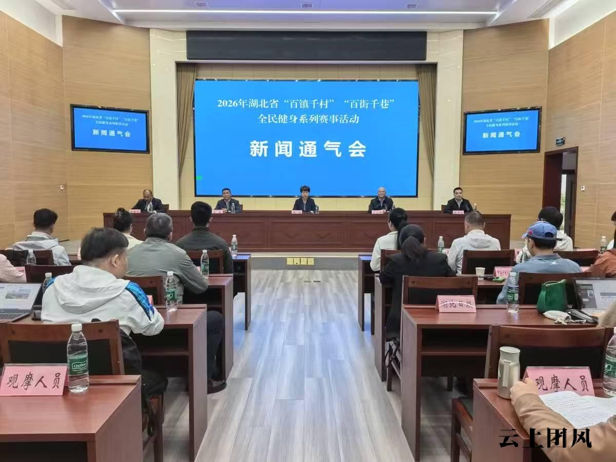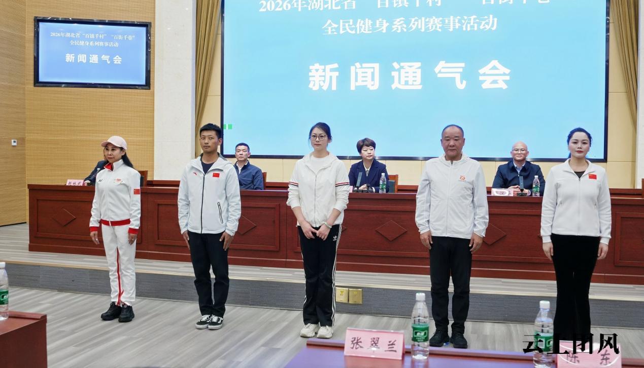 4月23日下午,2026年湖北省“百镇千村”“百街千巷”全民健身系列赛事活动新闻通气会在团风县人民政府举行。省体育局群众体育处处长周芳、省社会体育管理中心主任严汉华、黄冈市体育事业发展中心副主任汪敏及团风县人民政府副县长周厚瑜出席会议并回答记者提问。体育冠军代表、特聘讲师代表、各市州体育部门代表、各承办地体育部门和乡镇街道代表,以及央省市级媒体记者参会。会议由团风县委宣传部副部长赵林武主持。