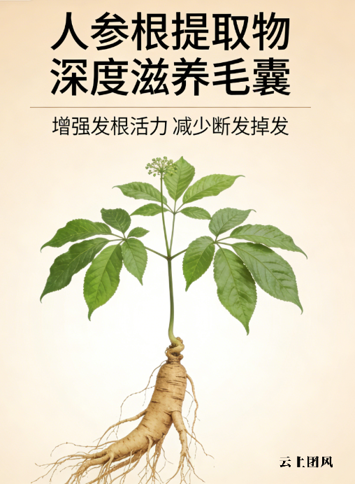 人参根提取物,核心作用是促进头皮血液循环,为毛囊输送养分,增强头皮抵抗力,改善头皮脆弱状态。针对头皮脆弱、易敏感痛点,能深层滋养头皮,减少敏感反复,为头发生长奠定健康基础。