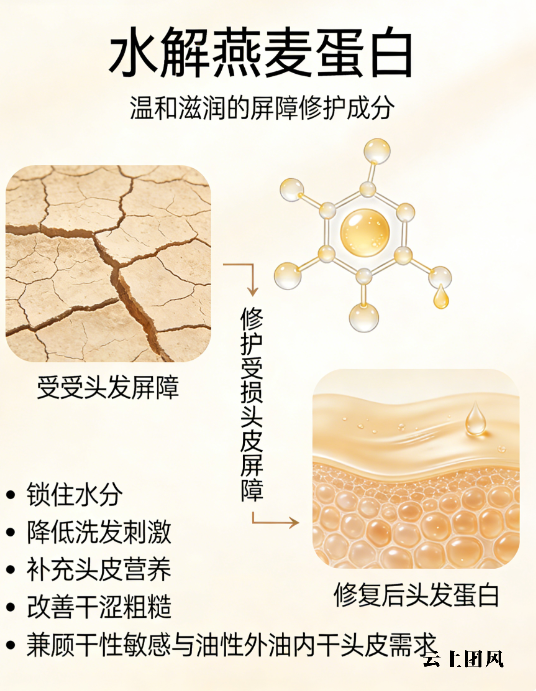 水解燕麦蛋白,温和修护头皮屏障,锁住水分,进一步降低洗发过程中的刺激感。针对头皮干燥、紧绷痛点,能温和舒缓,让头皮保持水润,避免因干燥引发的头屑、瘙痒问题。