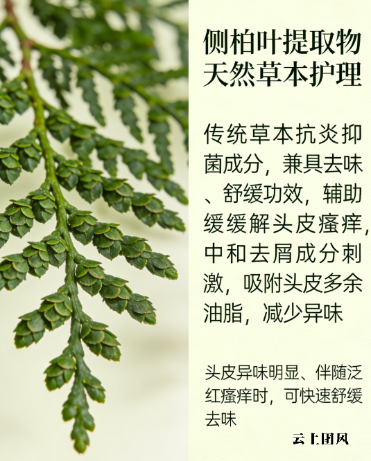 侧柏叶提取物,传统草本抗炎抑菌成分,核心作用是辅助减轻头皮瘙痒,搭配吡罗克酮乙醇胺盐,形成“科学去屑+草本舒缓”的双重保障。针对头皮瘙痒、油头异味痛点,能进一步舒缓头皮,减少油脂分泌,让头皮保持清爽。