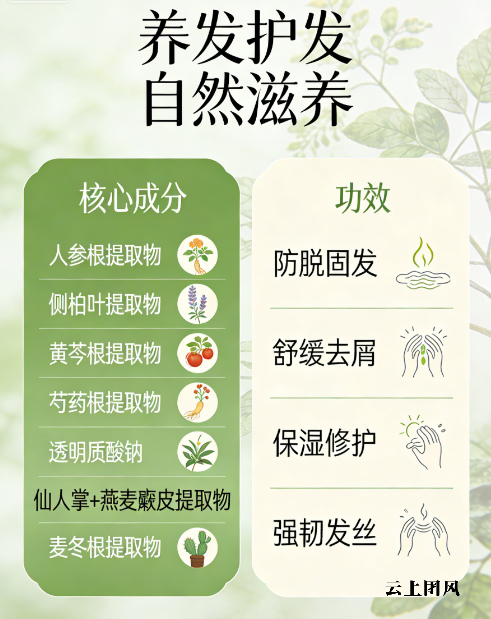 核心成分逻辑:天然植萃营养+专利温和养护双加持。优先甄选易吸收植萃滋养成分,搭配多重专利屏障修护成分,拒绝劣质工业油脂、刺激性促渗辅料。去屑止痒依托温和合规活性成分,不损伤毛囊活力,养护同步优化头皮微生态,为营养吸收打造健康适配环境,适配敏感头皮、受损发质长期高频使用。